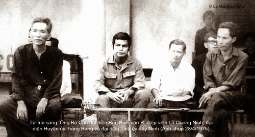 Từ trái sang: Ông Ba Cao đại diện Ban Binh vận R, điệp viên Lê Quang Ninh, đại diện Huyện ủy Trảng Bàng và đại diện Tỉnh ủy Tây Ninh (Ảnh chụp 28/4/1975)